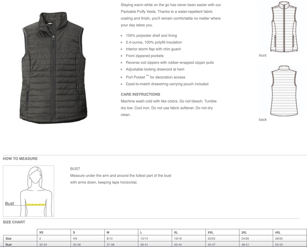 Ladies & Mens ADULT Packable Puffy Vest.