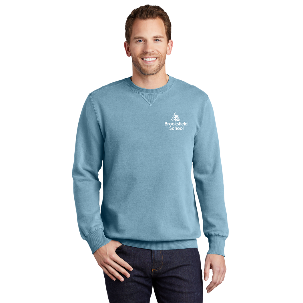 Mens/Unisex ADULT Beach Washed Garment Dyed Crewneck Sweatshirt.. Aged-to-perfection color, this soft, comfortable sweatshirt is essential and authentic. 8.6 oz, 80/20 ring spun cotton/poly fleece fabric. 100% cotton fabric face. V-inset at neck. Port & Co Garment Dyed Retail / Resort Brand.
