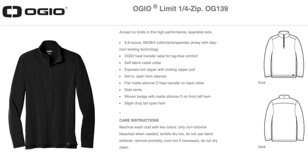 Top styling, quality and performance, from a top brand - OGIO. Accept no limits in this high-performance, layerable, 1/4 zip pullover. Tri fabric blend - 58%/38%/4% cotton/poly/spandex jersey - with stay-cool wicking technology.