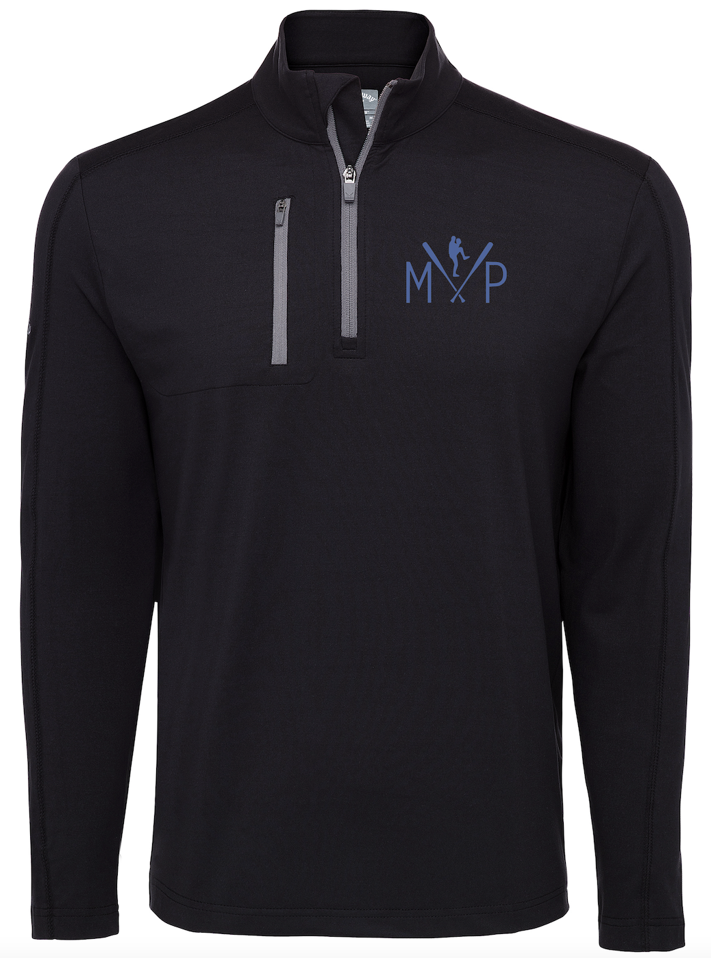 88% Polyester / 12% Spandex, double knit brushed fabric with water repellent finish. Stretch to give you full range of motion. UV Repel technology keeps skin safe from the sun's harmful rays UPF 50+. Quarter-zip with reverse coil zipper with Callaway logo pull and zipper garage. Vertical chest pocket with Callaway logo pull. Contrast embroidered Callaway logo on right sleeve. MVP logo embroidered on left chest. Black Garment color.